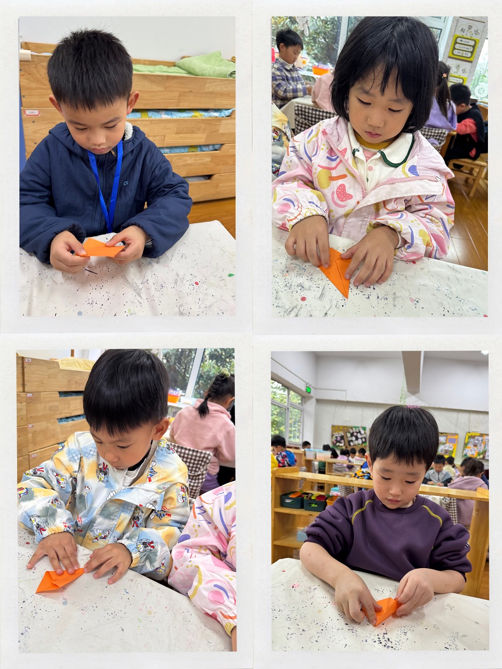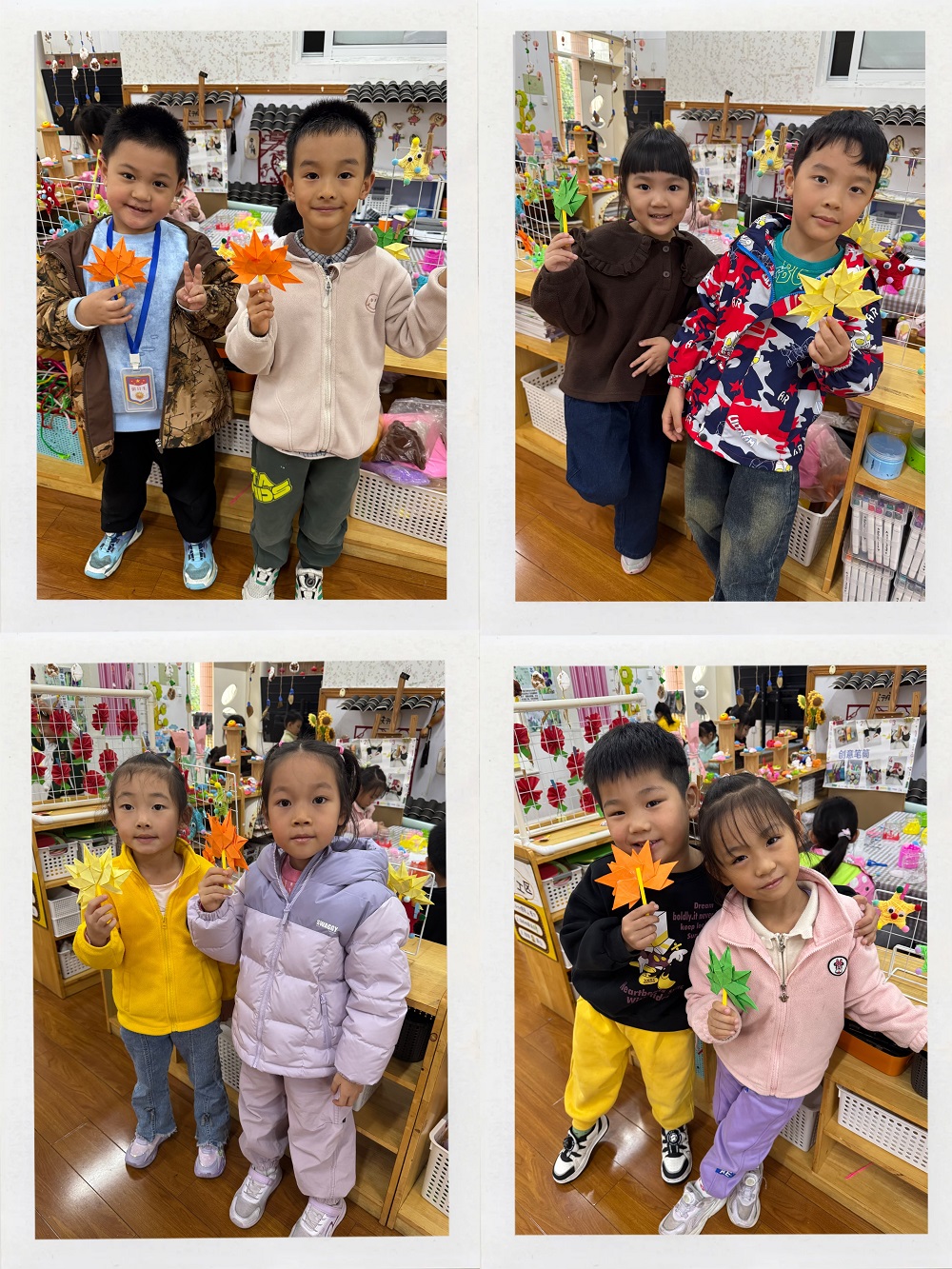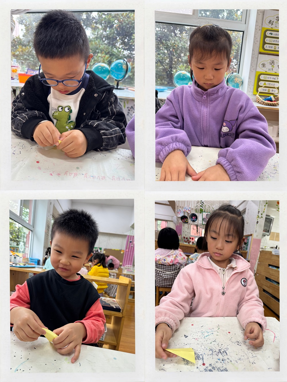 秋天到了,梧桐树的树叶也渐渐变黄了,小朋友们通过对梧桐树叶的欣赏,利用纸片进行创作,通过小组合作的方式,折出了一片片梧桐树的树叶。通过折梧桐树叶,既锻炼了手指的灵活性,也提升了小朋友们的团队合作意识。