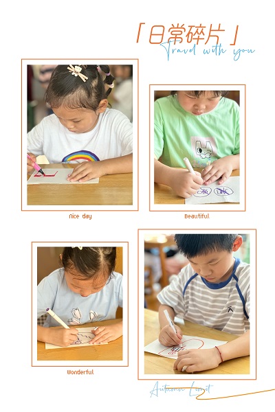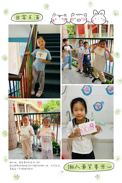 希希说:"老师,你看,我设计的是禁止捞小鱼的标志",妮妮说:"老师,我设计的是不能在滑滑梯上跑的标志",心宝说:"老师,你看我的,我这是小心上楼梯的标志!"孩子们纷纷向老师展示自己设计的安全标志,真是超级棒呢!
