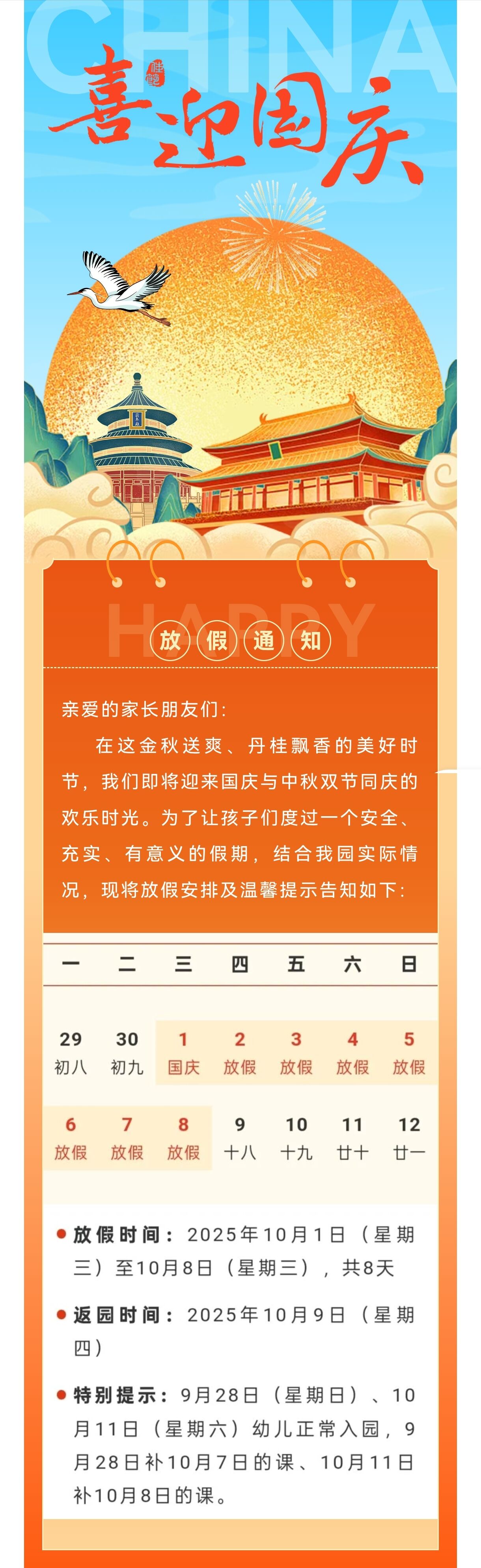 | 南京嵩山路幼儿园国庆节放假通知以及温馨提示 | 作者:管理员 发布时间:2025-09-30 13:21:08.0 |