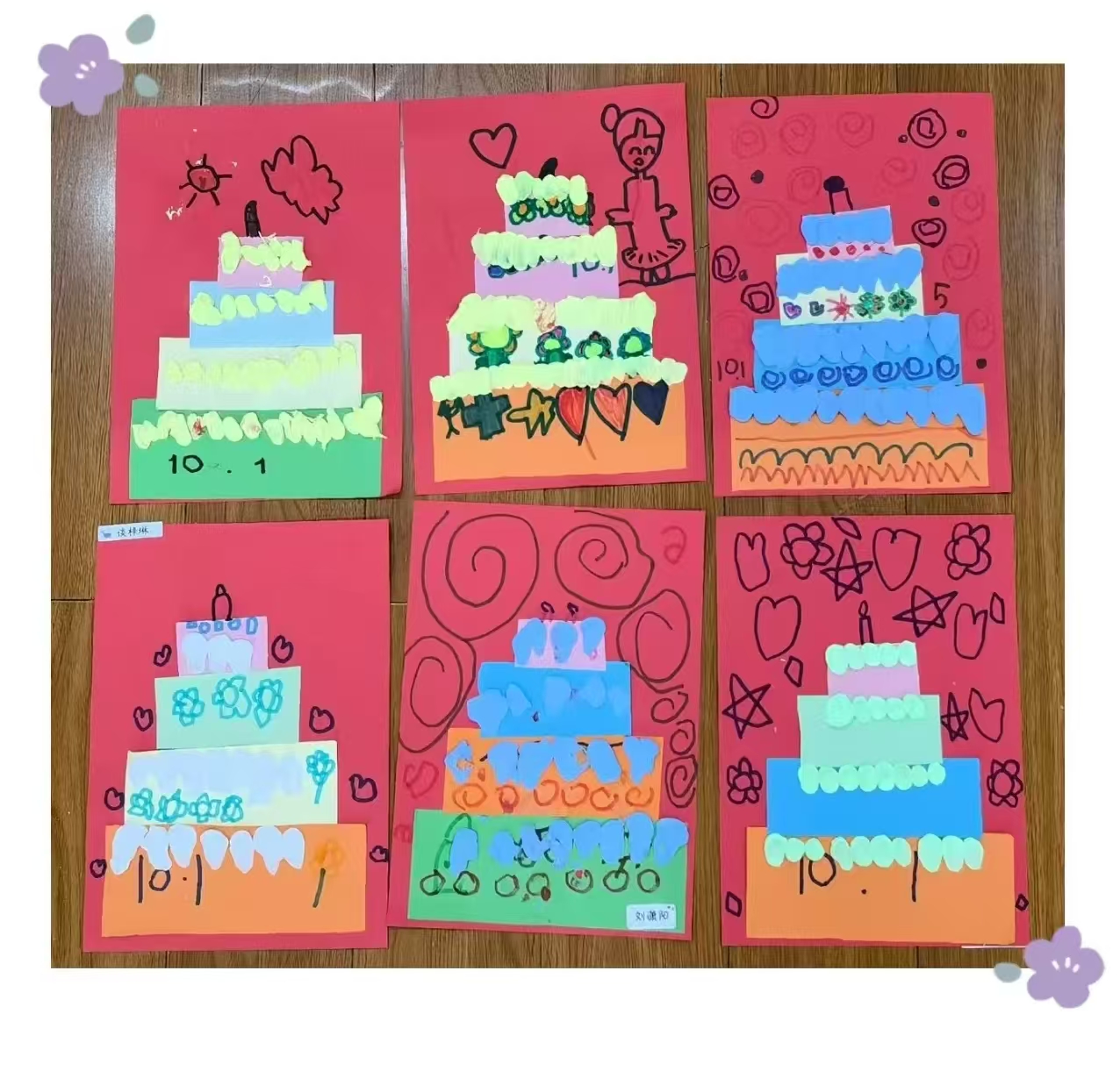孩子们用他们稚嫩的小手,为祖国妈妈精心制作生日蛋糕。他们撕彩纸、画糖果,全神贯注地装饰着蛋糕,将节日的祝福融入这甜蜜的创作之中。在欢声笑语中,一个个充满童趣的蛋糕逐渐成形,孩子们以独特的方式表达着对祖国的深厚热爱,同时也收获了动手实践的快乐和成长的喜悦。